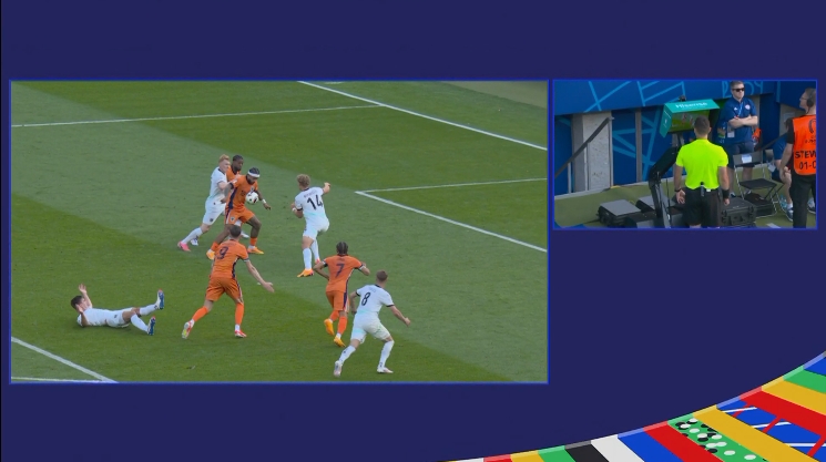 6月26日讯 欧洲杯小组赛D组第3轮,荷兰vs奥地利。比赛第75分钟,韦霍斯特头球摆渡助攻德佩破门,但裁判第一时间吹罚德佩手球犯规。随后VAR介入,确认德佩没有手球