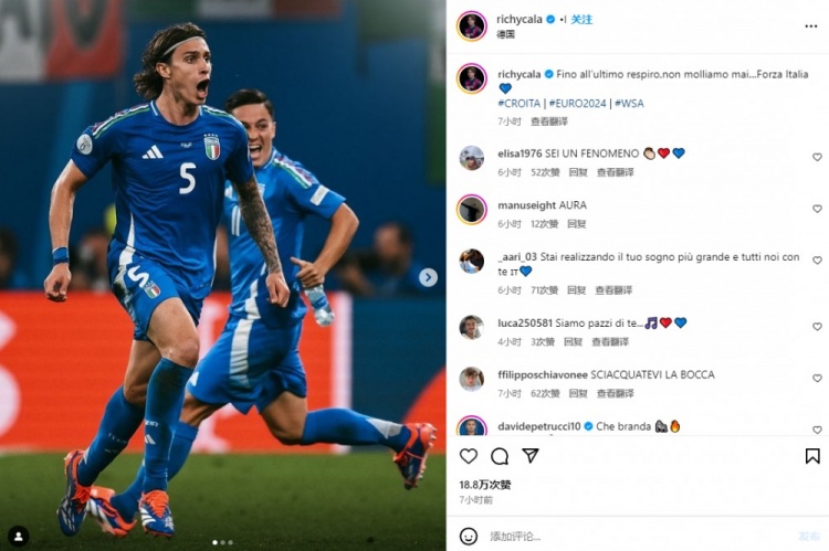 他晒出了自己的比赛照,并配文:“直到最后一刻,我们也没有放弃。意大利加油!”