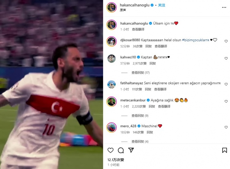 晋级16强!恰尔汗奥卢社媒晒进球:为了我的国家!