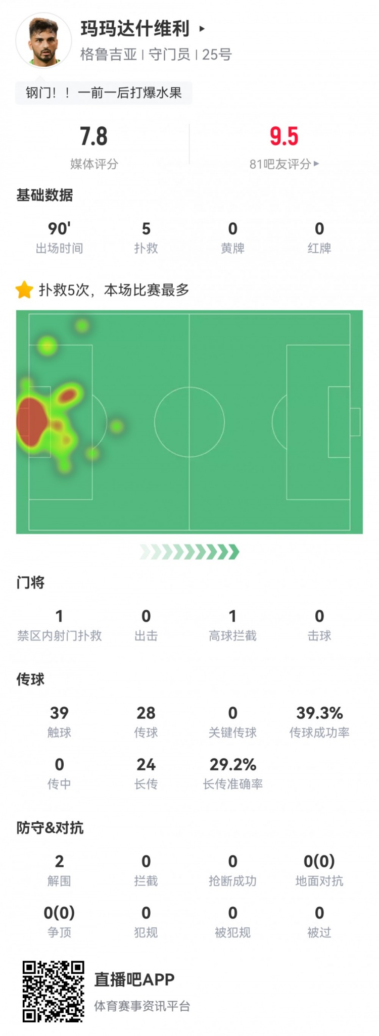 一夫当关!玛玛达什维利数据:5次扑救,2次解围,评分7.8