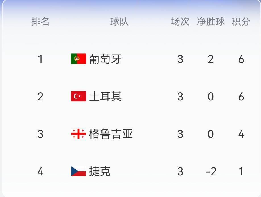 最终积分榜出炉,葡萄牙头名出线,土耳其第二、格鲁吉亚第三出线,捷克垫底出局。