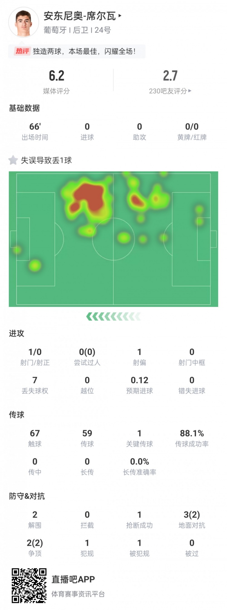安东尼奥-席尔瓦数据:1次回传失误致丢球,1次送点,评分6.2最低
