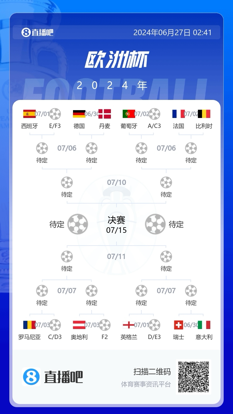 06月27日讯 欧洲杯小组赛第三轮只剩F组未赛,荷兰已确定将和英格兰、意大利同半区。