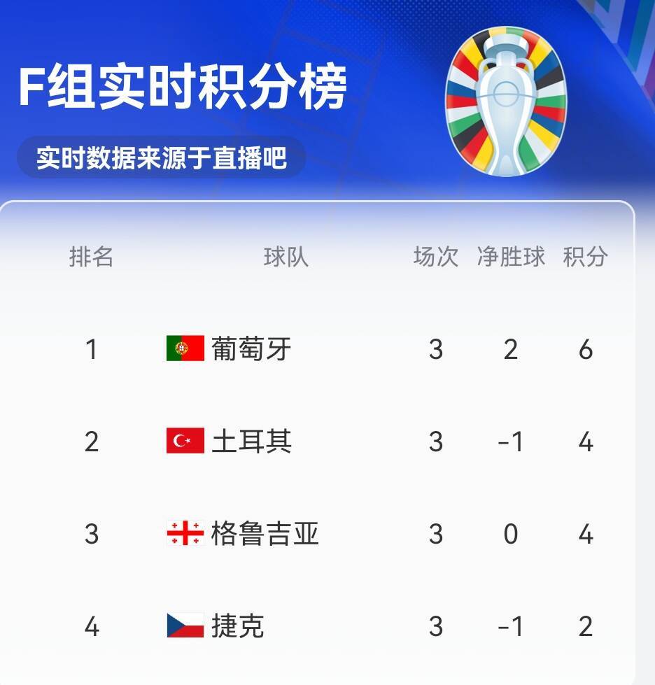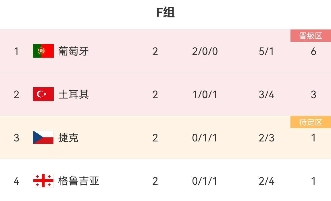F组实时积分榜:葡萄牙6分第一,土耳其6分第二,格鲁吉亚4分第三