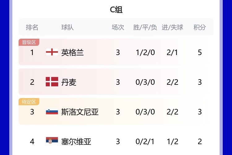 而在C组,丹麦和斯洛文尼亚积3分分列小组二三位,均已确认出线。