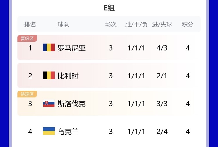 06月27日讯 欧洲杯E组第3轮,乌克兰0-0战平比利时,本组4队均1胜1平1负积4分,乌克兰净胜球最低,垫底出局。而在C组,丹麦和斯洛文尼亚积3分分列小组二三位,均已确认