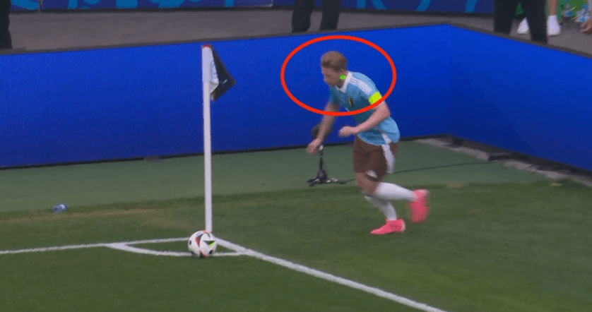 06月27日讯 欧洲杯小组赛E组第3轮,乌克兰vs比利时,比赛第14分钟,德布劳内开出角球,镜头给到他遭到球迷激光照脸。