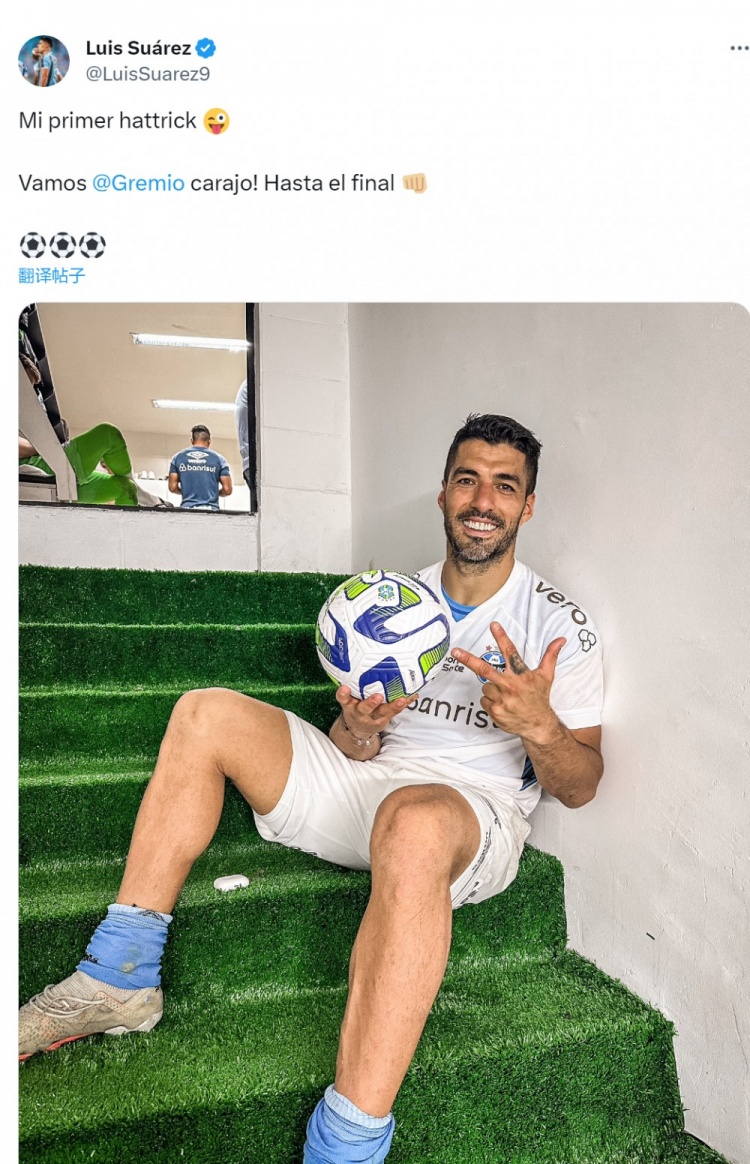 赛后苏亚雷斯在社交媒体上晒出自己与比赛用球的合照,并写道:“我(在格雷米奥)的首个帽子戏法