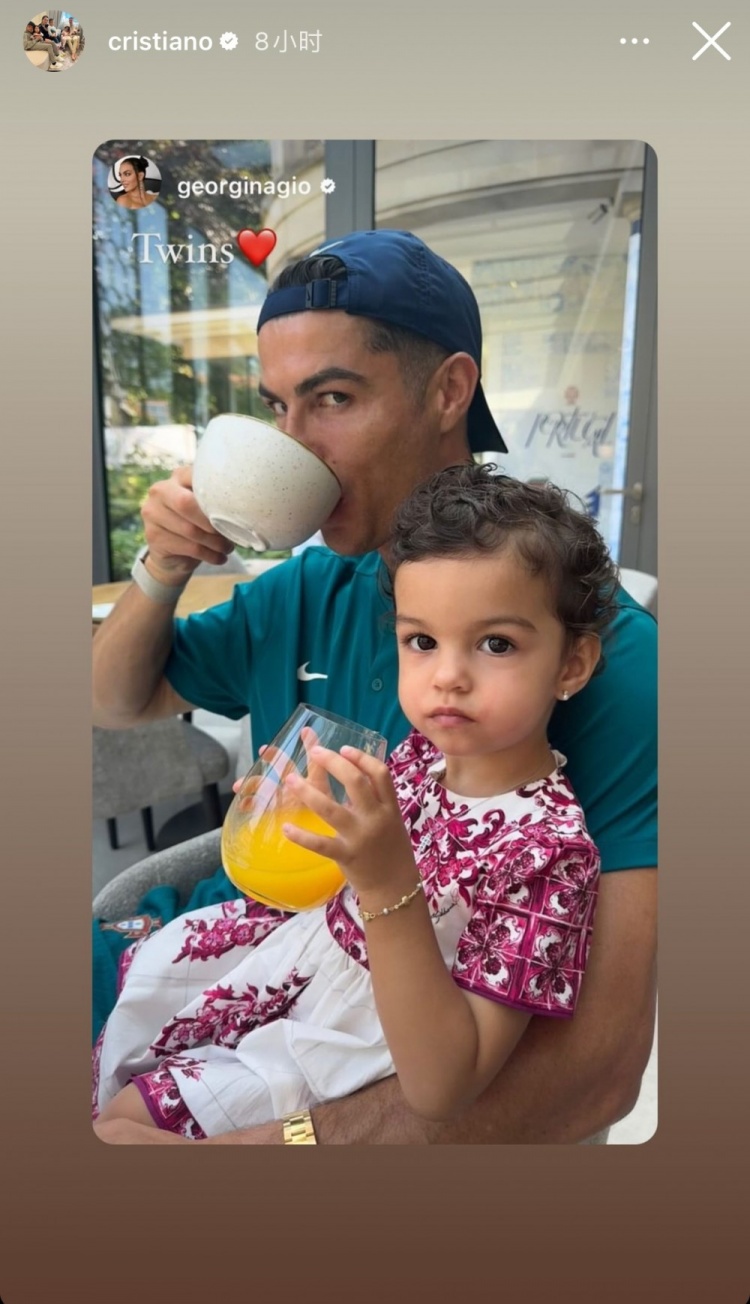 乔治娜社媒晒出C罗怀抱着小女儿贝拉共饮的照片,并配文写道:“双胞胎。”C罗在社媒上也转发了这条动态。