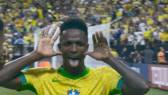 维尼修斯上半场完成梅开二度后,模仿了内马尔的经典庆祝动作。