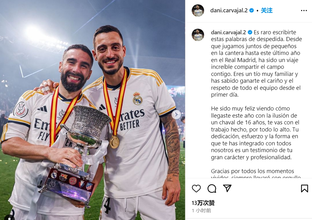 卡瓦哈尔:写下这些告别你的文字,感觉很奇怪。从我们还是孩子的时候就在青训营一起踢球,到去年在皇马,与你一起分享足球是一段不可思议的旅程。你是一个非常随和的人,从第一天起,你就赢得了全队的喜爱和尊重。