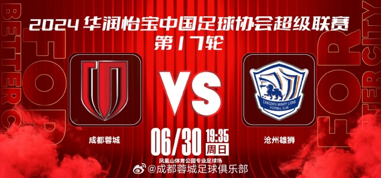比赛日——6月30日19:35,中超第17轮,成都蓉城vs沧州雄狮