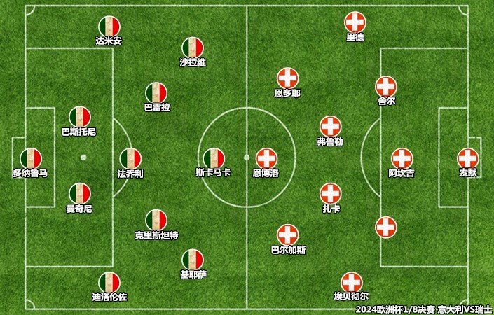 斯帕莱蒂不敢冒险使用年轻的贝拉诺瓦,却让长期在俱乐部踢不上球的法乔利坐镇中路要津;扎卡尼已经从绝杀克罗地亚的过程中建立了信心,本场获得首发资格的却是此前出场机会寥寥的沙拉维;迪洛伦佐和达米安分居两闸,巴斯托尼来到左中卫位置,巴雷拉却依然要在逆足位置上痛苦挣扎。瑞士以跑动和对抗能力出众著称,斯帕莱蒂希望双前锋组合能够分兵支援身后的队友,斯卡马卡的短板恰恰就是无球移动,坐在替补席上的拉斯帕多里和雷特吉更适合首发出场消耗对手。