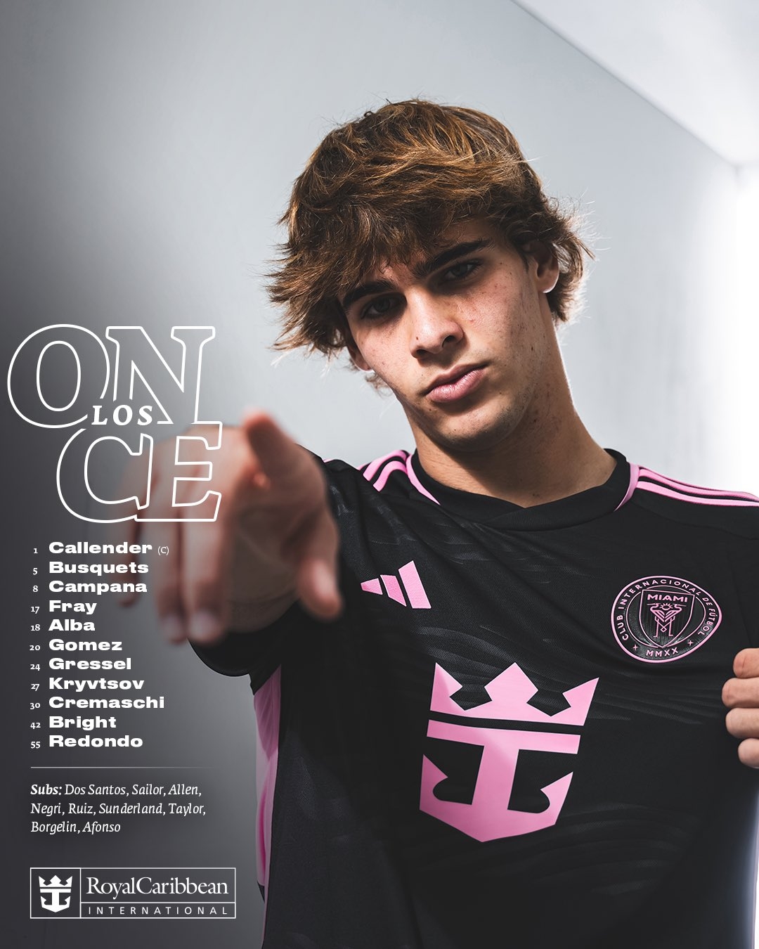 迈阿密国际首发:1-卡伦德、27-克里夫索夫、5-布斯克茨、17-弗雷、18-阿尔巴、30-克马斯基、42-布莱特、55-费德里科-雷东多、24-格雷塞尔、20-迭戈-戈麦斯、8-坎帕纳