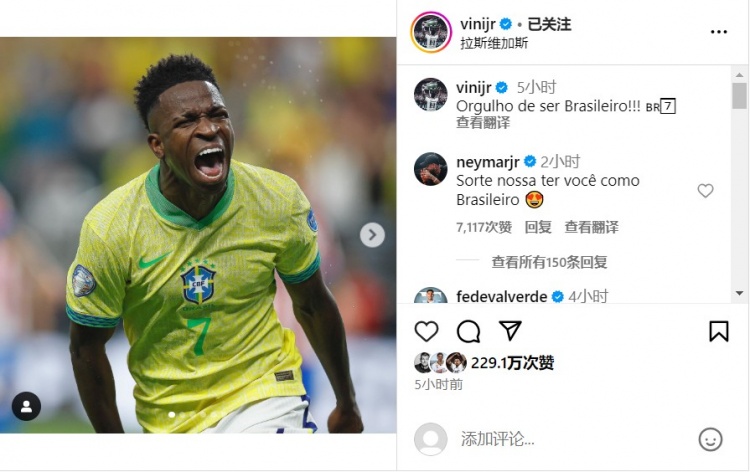 赛后维尼修斯更新社媒晒出自己的赛场照,并配文:为身为巴西人而感到自豪!!!