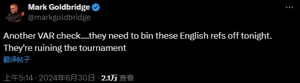 06月30日讯 欧洲杯1/8决赛,德国2-0丹麦晋级8强,本场比赛多次VAR介入。媒体人Mark Goldbridge吐槽:又一次VAR,今天晚上就应该把这些英国裁判解雇,他们毁了这项赛