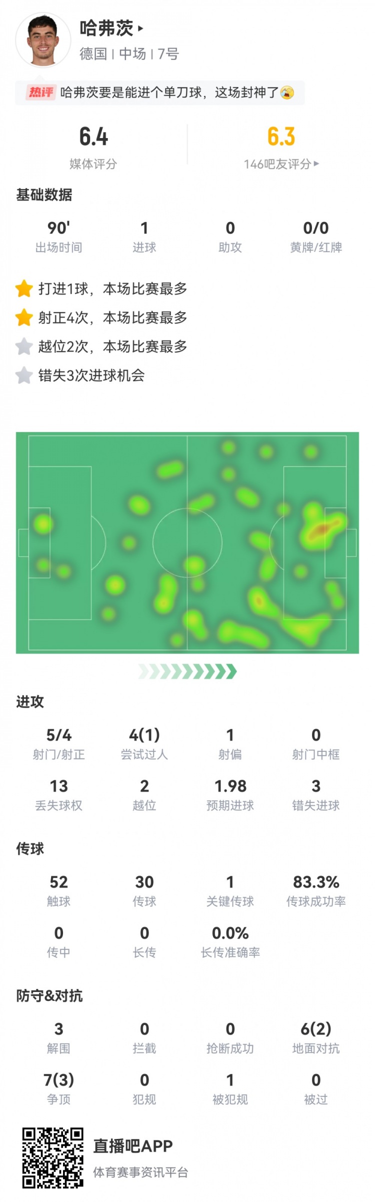 效果拉满!哈弗茨数据:1粒进球,3次错失良机,预期进球1.98