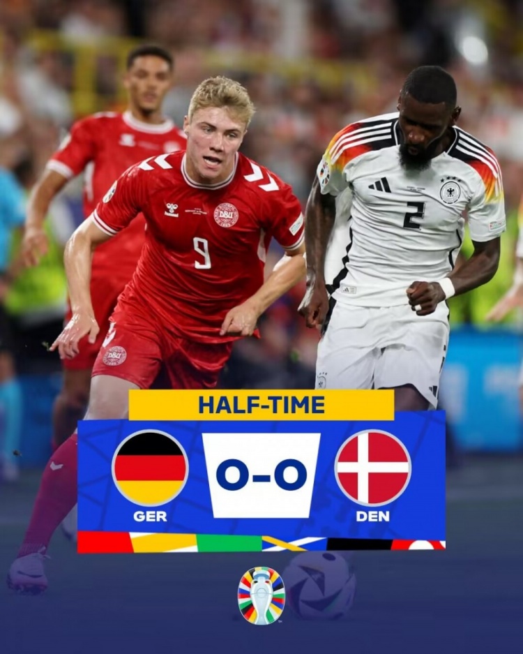 6月30日讯 欧洲杯1/8决赛,德国对阵丹麦。上半场,施洛特贝克闪击被吹,舒梅切尔、诺伊尔屡救险,现场出现极端雷暴天气比赛一度中断25分钟。半场战罢,德国0-0丹麦。