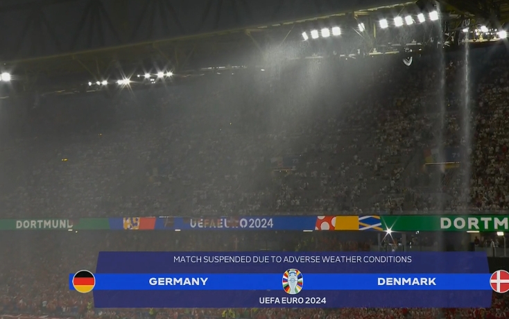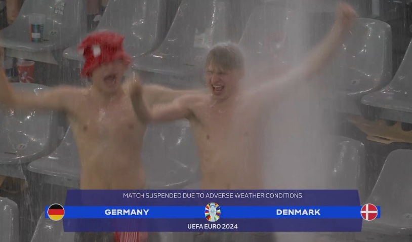 06月30日讯 德国vs丹麦因为雷暴天气中断。转播镜头给到,多特蒙德球场漏水了!球迷们在水帘里狂欢!