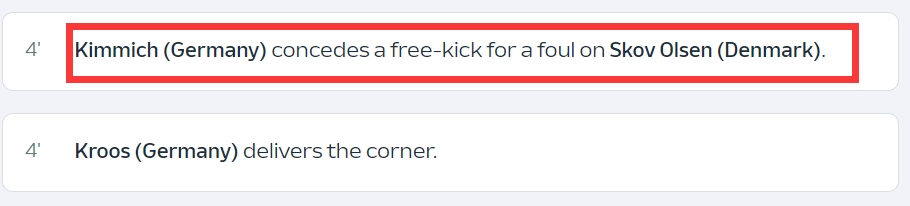 06月30日讯 欧洲杯1/8决赛,德国vs丹麦,开场4分钟,施洛特贝克破门,但因基米希阻挡防守球员犯规在先,进球无效。官方显示:基米希对奥尔森犯规在先
