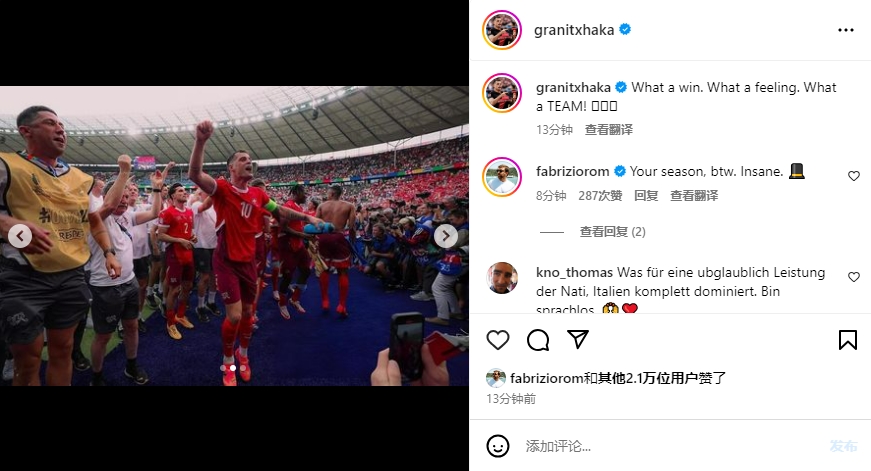 6月30日讯 欧洲杯1/8决赛首场较量,瑞士2-0淘汰卫冕冠军意大利。赛后,瑞士中场大将扎卡发社媒庆祝胜利。