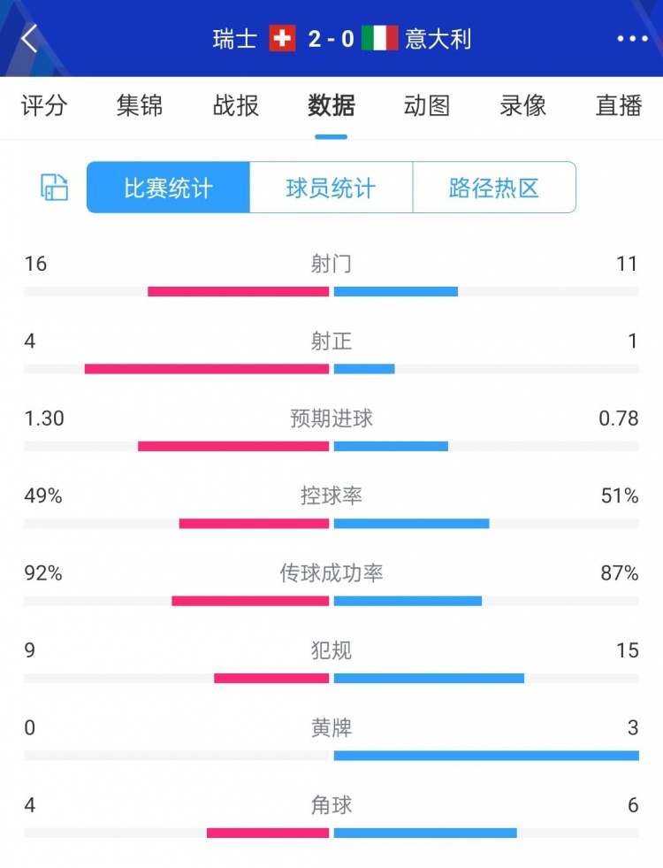 卫冕冠军完败!瑞士2-0意大利数据:瑞士16射4正 意大利11射仅1正
