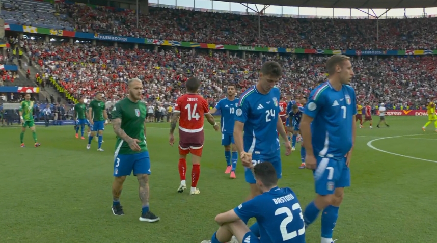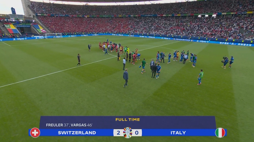 06月30日讯 2024欧洲杯首场1/8决赛,瑞士2-0击败意大利,晋级八强。赛后意大利球员心情不佳,简单致意后落寞离场。