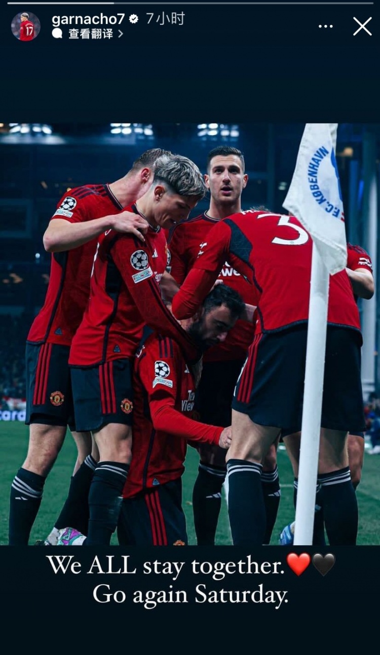 11月10日讯 本轮欧冠小组赛,十人作战的曼联3-4惜败哥本哈根。明晚,曼联将回到英超赛场,主场迎战卢顿。赛前,曼联球员们纷纷在社交媒体上鼓舞士气。加纳乔晒出