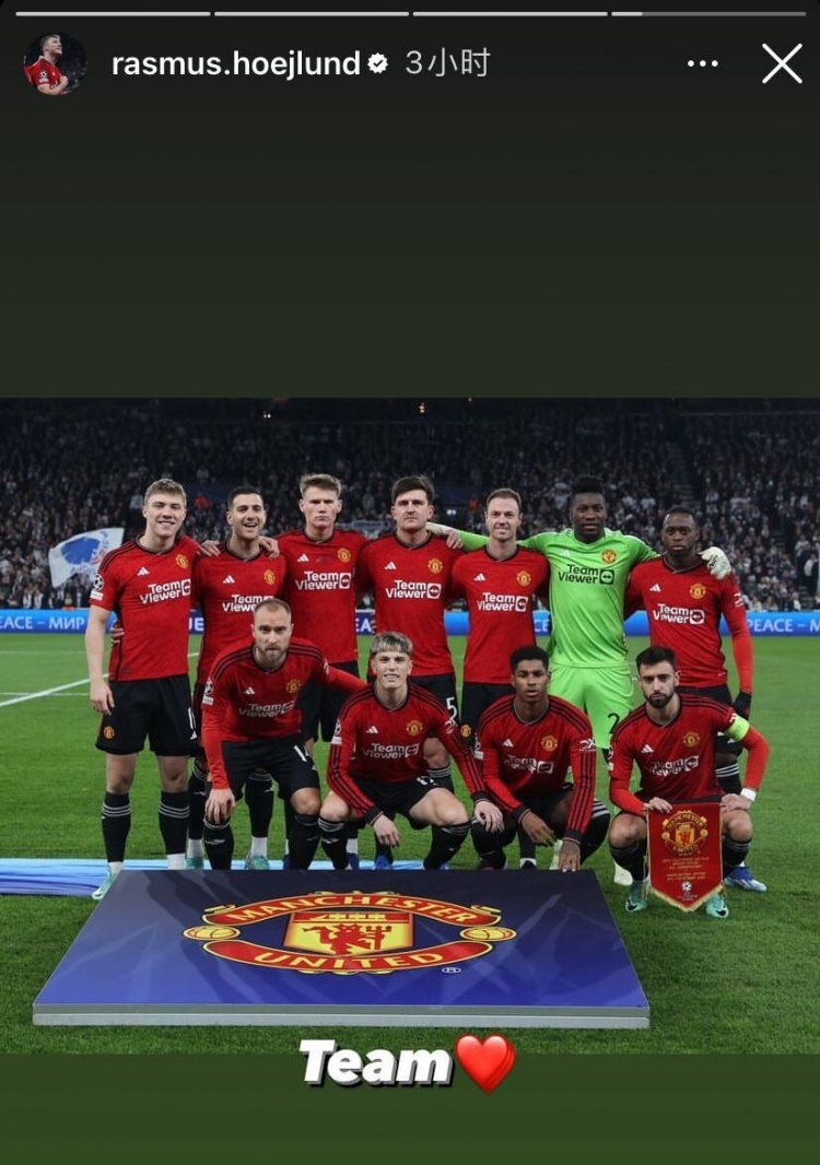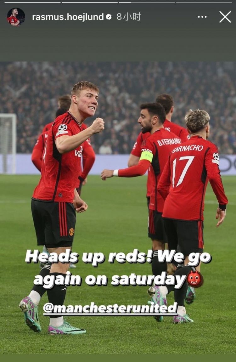 霍伊伦也晒出庆祝自己进球的照片,写道:“红魔们,把头抬起来!周六我们重整旗鼓!”随后他又晒出赛前球队的的合影,并配文:团队❤️”