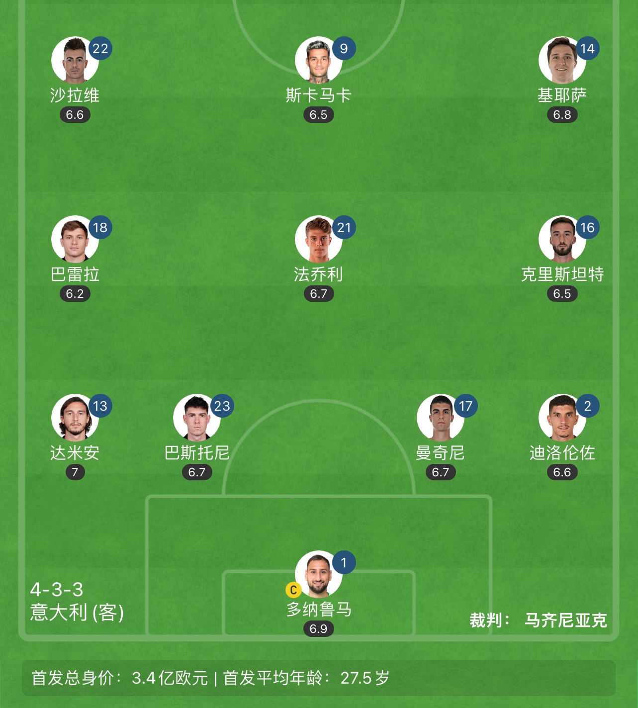 意大利半场评分:巴雷拉6.2分最低,达米安7分最高,多纳鲁马6.9