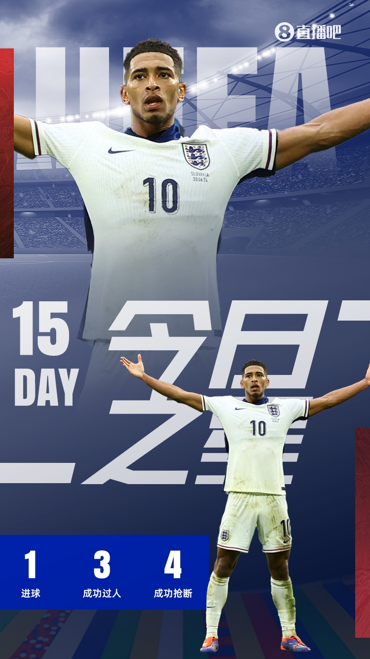 贝林厄姆的绝平球来自禁区内的倒钩打门,本场比赛他4次过人成功3次,16次对抗成功10次,此外还有4次成功抢断。大场面先生贝林厄姆,当选欧洲杯今日之星。