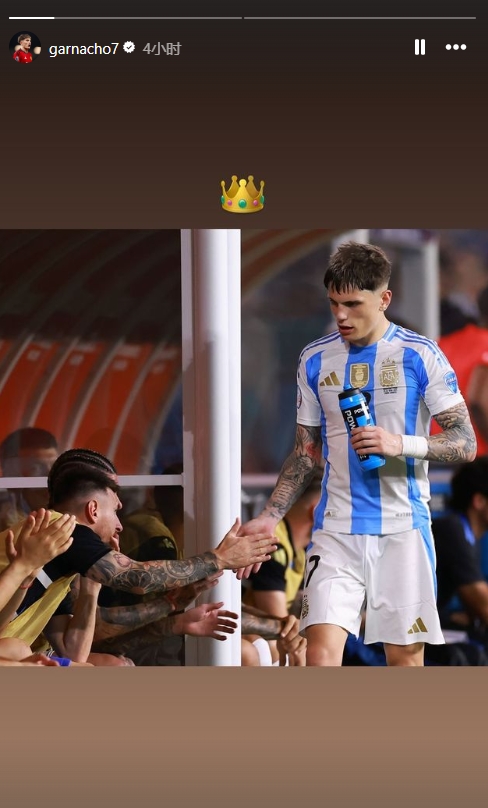 07月01日讯 昨日美洲杯小组赛第三轮,阿根廷2-0秘鲁。加纳乔此役上演了个人国家队大赛首秀,第66分钟被换下。今日加纳乔晒出了被换下时与梅西击掌的图,配上了