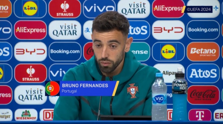 7月1日讯 葡萄牙将在欧洲杯1/8决赛迎战斯洛文尼亚,赛前,葡萄牙中场布鲁诺-费尔南德斯出席新闻发布会。