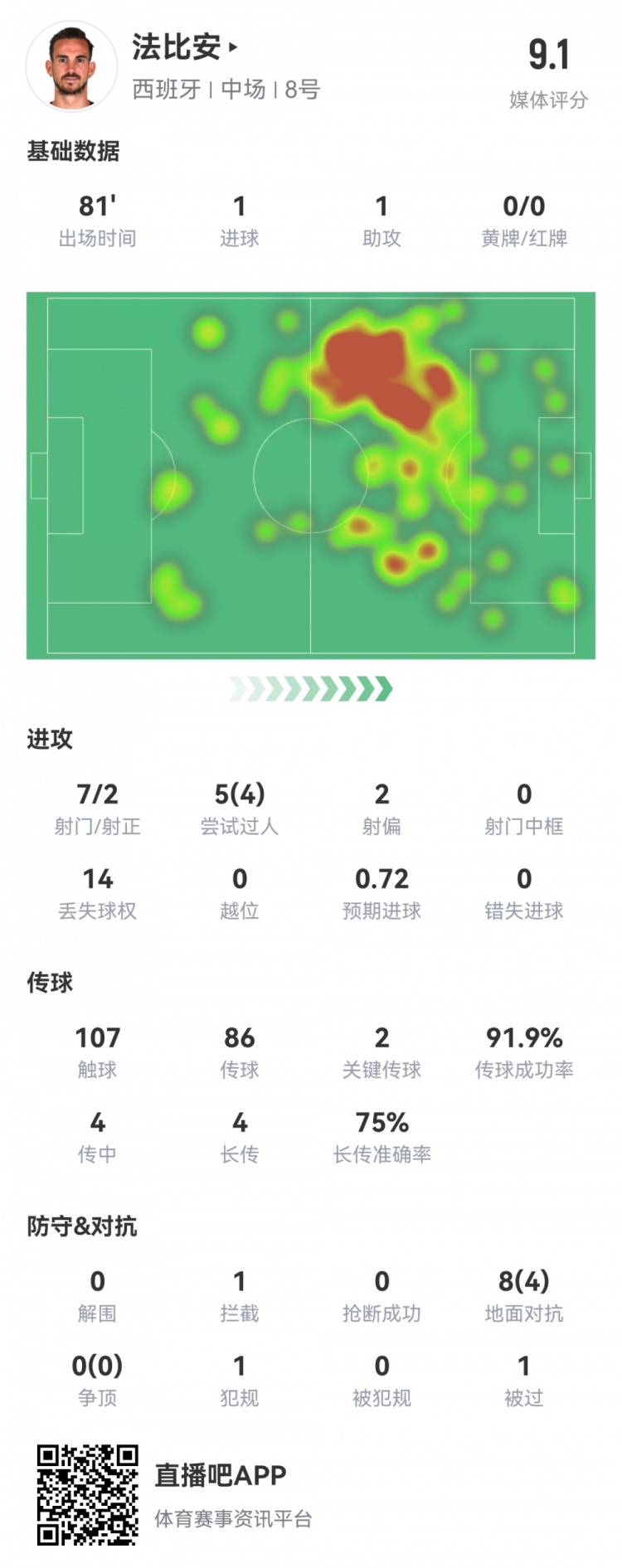 7月1日讯 正在进行的欧洲杯1/8决赛,西班牙4-1领先格鲁吉亚。此役法比安首发出场81分钟被换下,球员全场重点数据如下↓