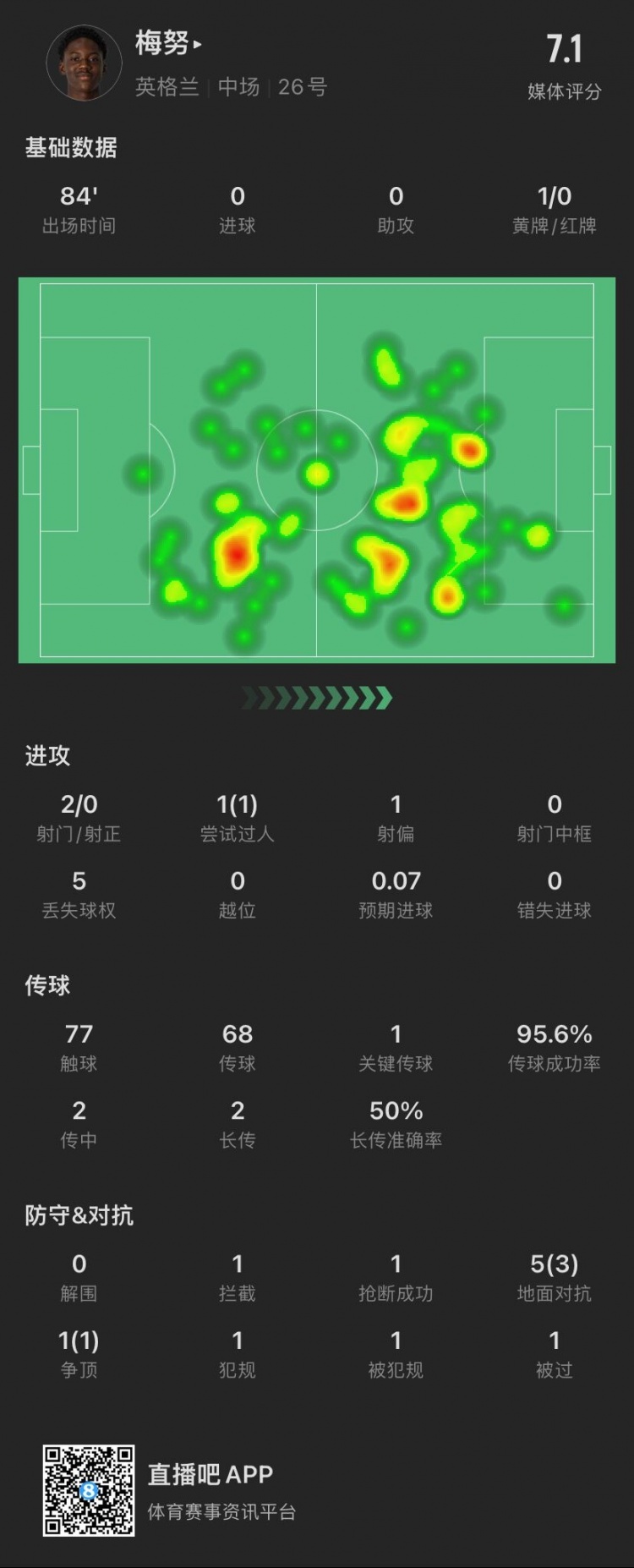 19岁梅努数据:1次关键传球,贡献1拦截1抢断,获评7.1分