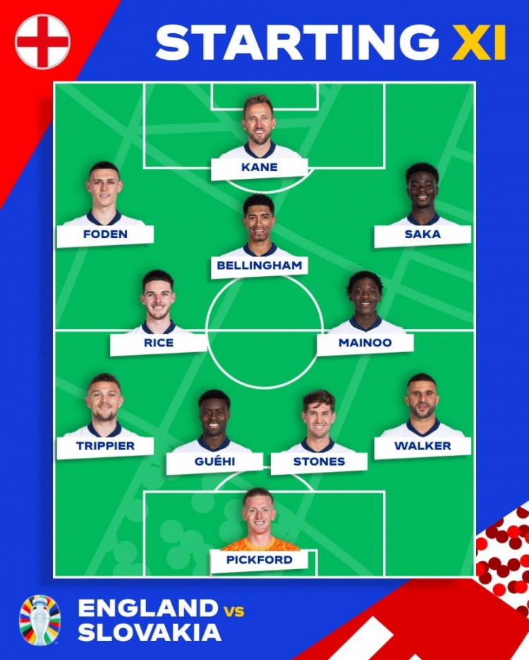 7月1日讯 欧洲杯1/8决赛,英格兰上半场0-1落后斯洛伐克,下半场回来英格兰队没有换人。