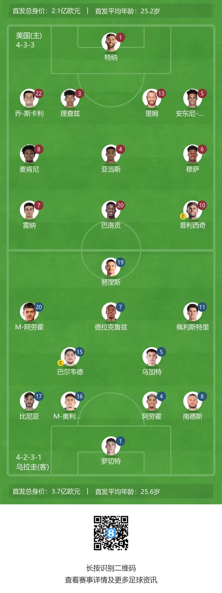 美洲杯-乌拉圭vs美国首发:努涅斯、巴尔韦德先发,苏亚雷斯替补