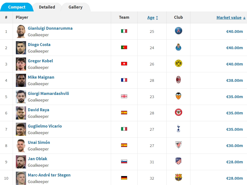 看看哥们实力!科斯塔在本届欧洲杯72名门将中 身价排名第一