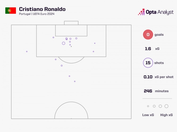 据统计,C罗已经完成15次射门,目前是本届最多,但他仍未取得进球。