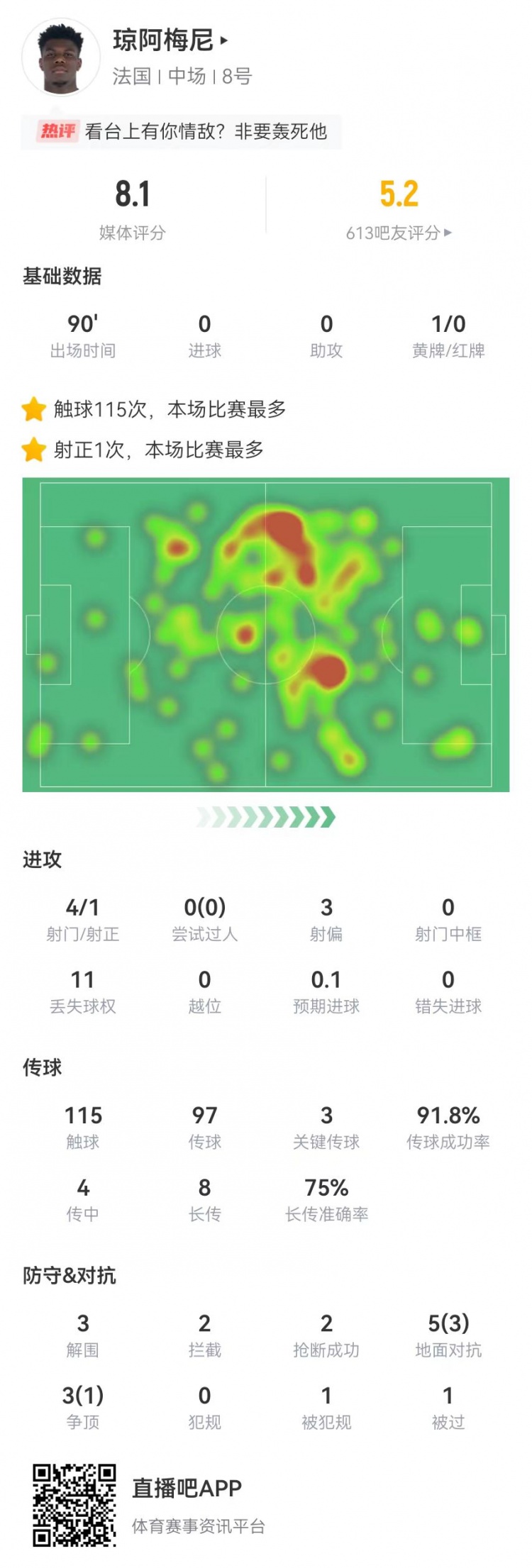 琼阿梅尼本场3关键传球+6成功长传 3解围2拦截2抢断 获评8.1分