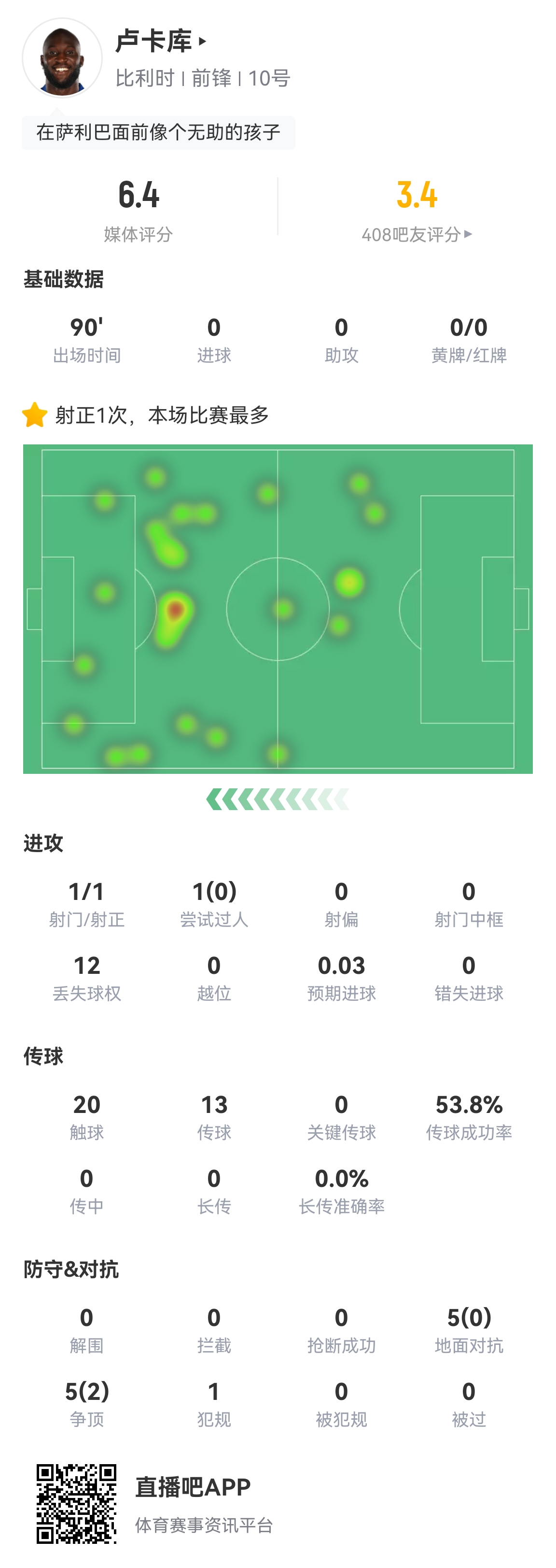 卢卡库全场数据:20次触球12次丢失球权,5次对抗无一成功