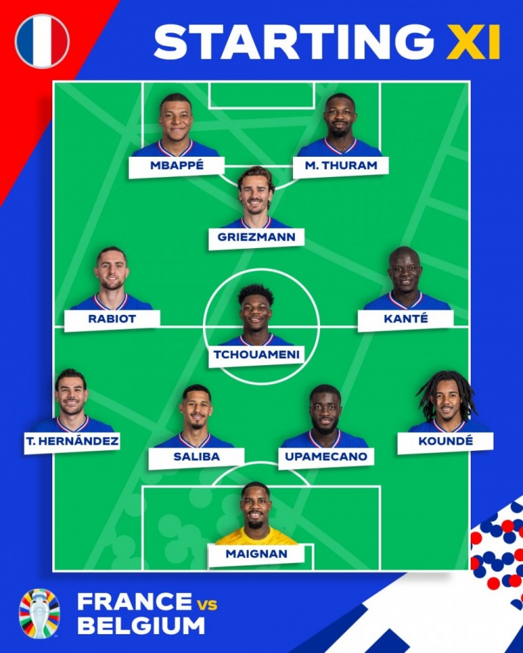 法国首发:16-迈尼昂、5-孔德、4-于帕梅卡诺、17-萨利巴、22-特奥、13-坎特、8-琼阿梅尼、14-拉比奥特、7-格列兹曼、10-姆巴佩、15-图拉姆