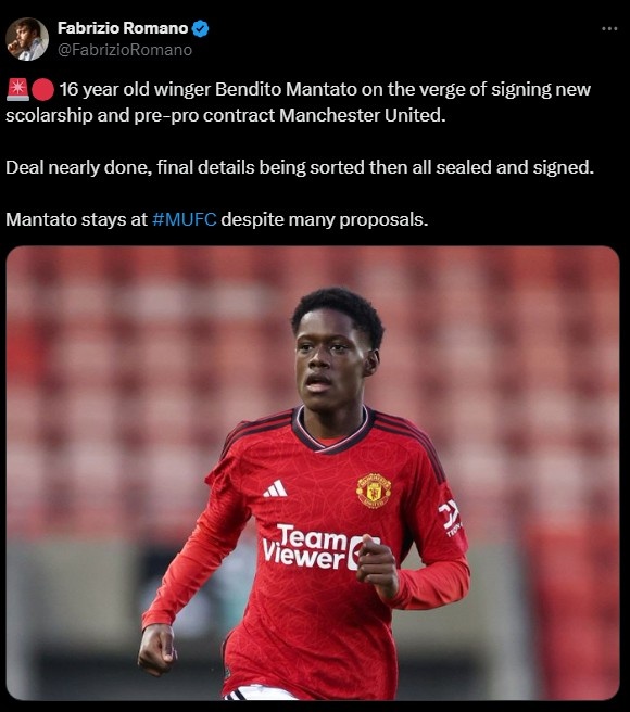 罗马诺表示:“16岁的边锋本迪托-曼塔托接近与曼联签下新的学徒和预备职业合同。”