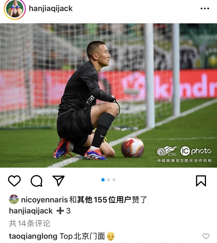 凭借着全场9次扑救的出色表现,韩佳奇帮助国安在上轮联赛2-0击败了老对手泰山队。赛后,韩佳奇在社媒晒出了个人的比赛照片并配文“+3”,而陶强龙则留言称赞韩佳奇是“Top北京门面”。