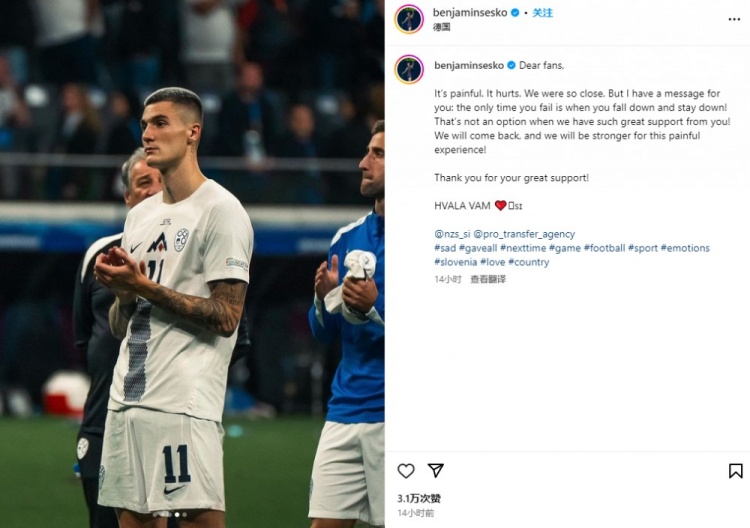 7月3日讯 斯洛文尼亚在点球大战不敌葡萄牙,中锋塞斯科在加时赛最后时刻错失单刀绝杀。他也在赛后通过社媒发文致歉:“亲爱的球迷们。这种感觉令人痛苦,让人内