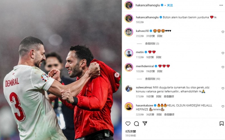 在本轮因累计黄牌停赛的恰尔汗奥卢在赛后晒出自己和进球功臣德米拉尔相拥激情庆祝的照片,并配文:“全世界都要为我的国家让步。”