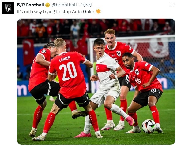 7月3日讯 土耳其在本轮欧洲杯2-1力克奥地利,他们也得以挺进欧洲杯八强。欧洲杯官推也晒出了一张“名画”级别的经典围堵照,只是这次的主角换成了皇马19岁前