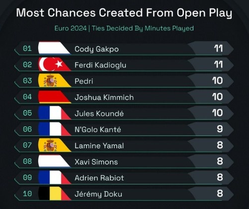 欧洲杯运动战制造机会榜:加克波11次、基米希10次,巴萨3将在列