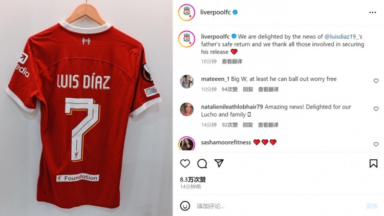 利物浦晒迪亚斯球衣:很高兴获悉他父亲平安归来,感谢所有人支持