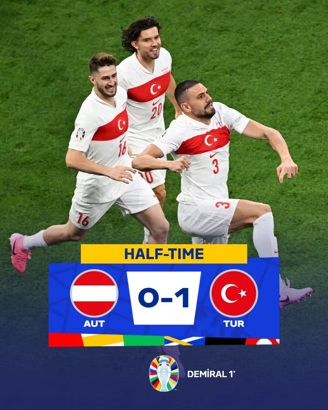 7月3日讯 北京时间3:00,欧洲杯1/8决赛奥地利vs土耳其。上半场,德米拉尔开场57秒乱战中闪击破门!半场结束,土耳其暂时1-0领先奥地利↓